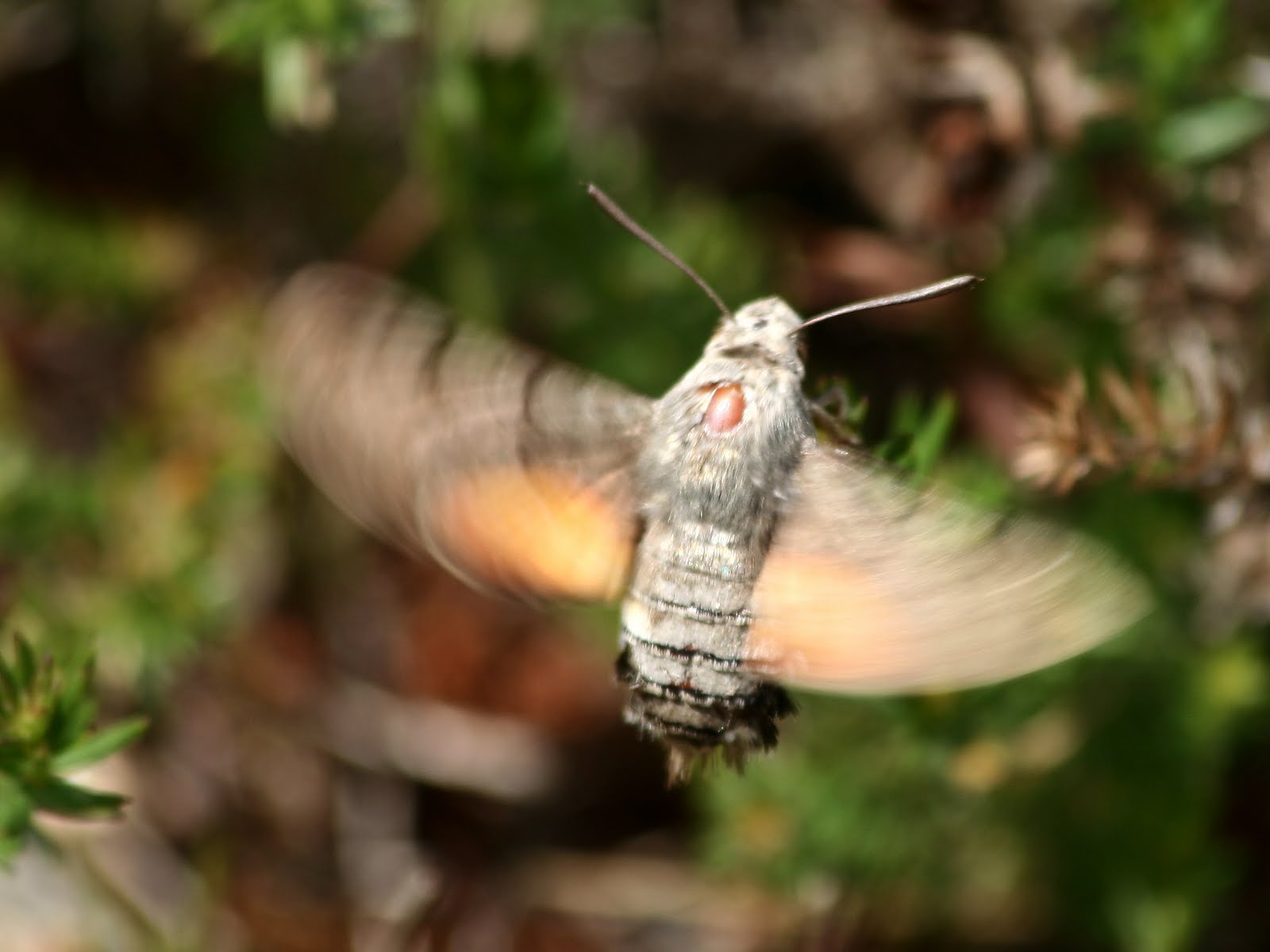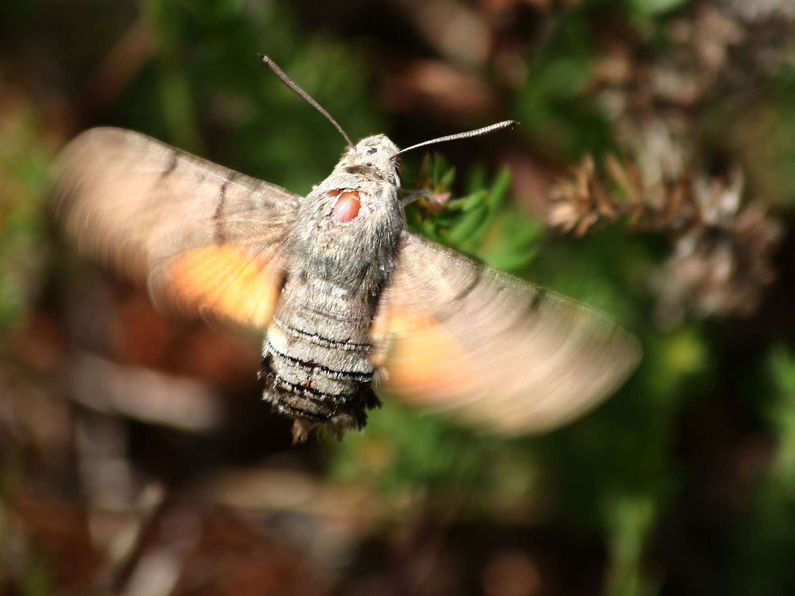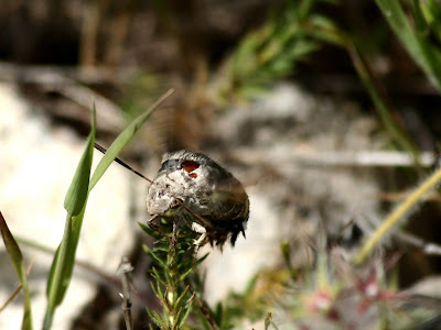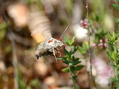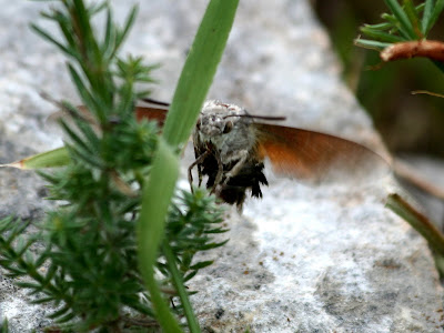 Macroglossum stellatarum, a borboleta colibri, borboleta nocturna que se alimenta durante o dia sem nunca pousar, alimenta-se das plantas sempre batendo as asas a uma velocidade incrivel.