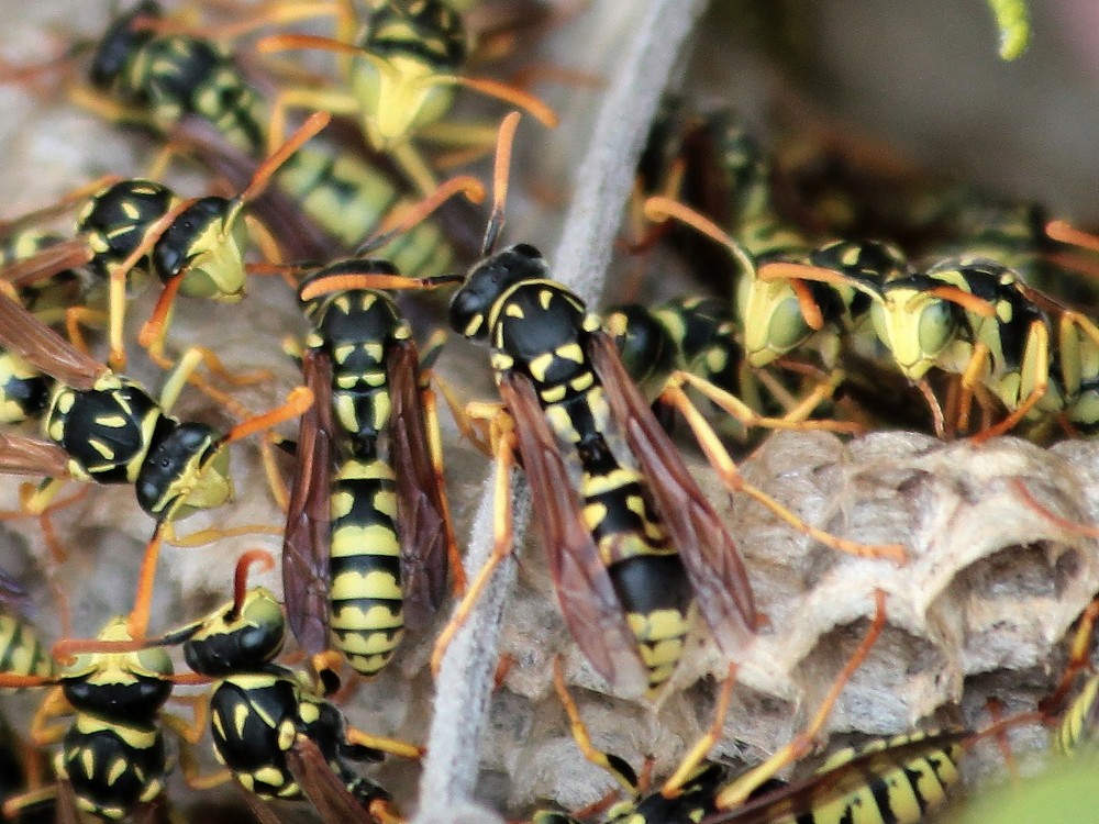 Nestas fotos vêem-se bem os olhos das vespas, na foto de baixo estão assinalados cercados a branco as estruturas alveolares e, na vespa central, os três olhos individuais no alto da cabeça. Equipadas assim elas dão sempre conta de qualquer movimento.