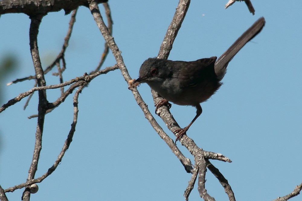 Sardinian warbler female carrying a Thomise spider to feed the little ones